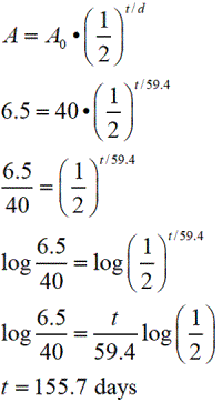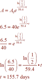 The half-life of Iodine-125 is 59.4 days. How long, in days, will it take 40 grams to decay to 6.5 grams? Round to nearest tenth of a day.