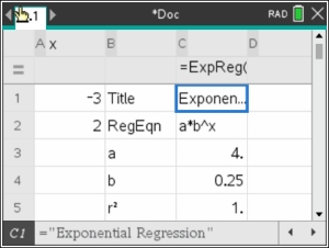 Solution: We will be using the graphing calculator's ability to prepare an exponential regression equation to find the solution to this problem. Under these conditions, we will be obtaining the actual equation (and not an approximation, or best fit, for the equation).